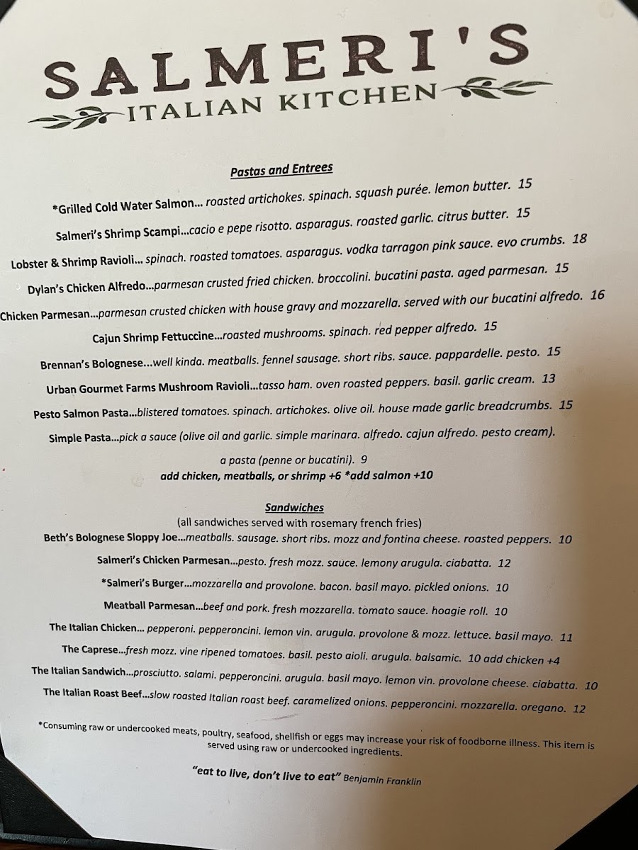 Salmeri's Italian Kitchen offers a diverse and tempting menu that caters to various tastes and dining preferences. Starting with appetizers, guests can enjoy a selection like Roasted Cauliflower and Crispy Arancini, while the dinner options expand to include more indulgent dishes such as Fig and Goat Cheese and Pepperoni Pull Apart Bread. For pizza lovers, there's an array of choices, including the hearty House Meatball and Ricotta Pizza and the classic Margherita Pizza. Pasta dishes are a standout, featuring rich options like Chicken Carbonara and Lobster & Shrimp Ravioli, as well as flavorful options like Cajun Shrimp Fettuccine. For those seeking something lighter, there are multiple fresh salads, including the vibrant Strawberry Burrata Salad and Salmeri's Caprese Salad. Proteins are plentiful, with choices like A La Carte Fried Chicken, Shrimp, and Salmon available to complement any meal. For a fulfilling dinner, consider the robust Chianti Braised Beef Short Ribs or the comforting Eggplant Parmesan. Families with kids can enjoy simpler options, such as Kid’s Alfredo or Kid's Pizza. The dessert menu rounds out the experience with indulgent treats like Tiramisu and Limoncello Dream Cake. Salmeri’s also offers a variety of sides and sauces to customize your meal, including A La Carte Fries and Wedding Soup by the pint. Whether visiting for lunch or dinner, the menu at Salmeri's Italian Kitchen promises something to satisfy every palate.
